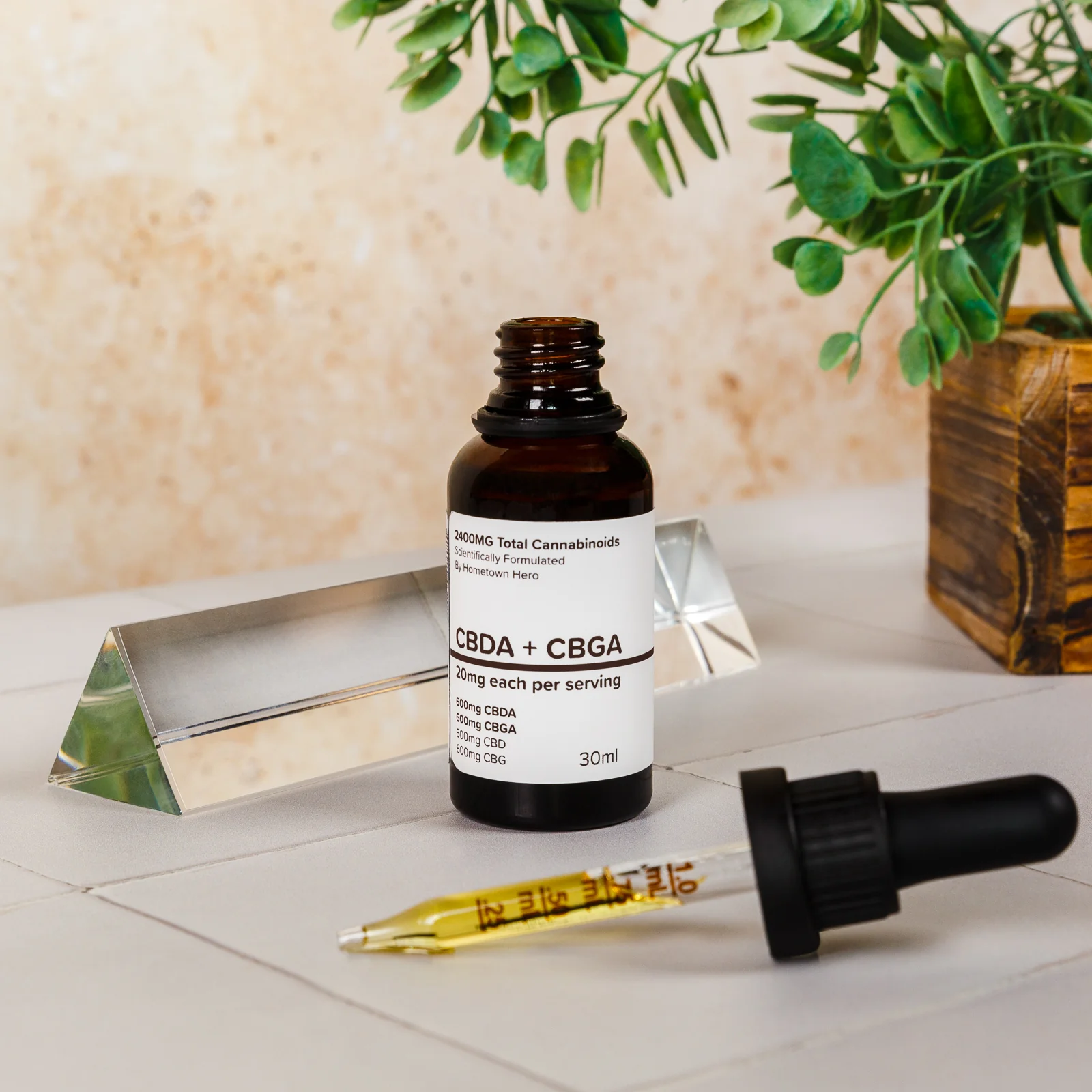 Add a drop of relaxation and relief to your routine with our CBDA + CBGA Tincture, made with a curated blend of natural hemp extracts. Each 30ml vial contains 2,400mg of cannabinoids.