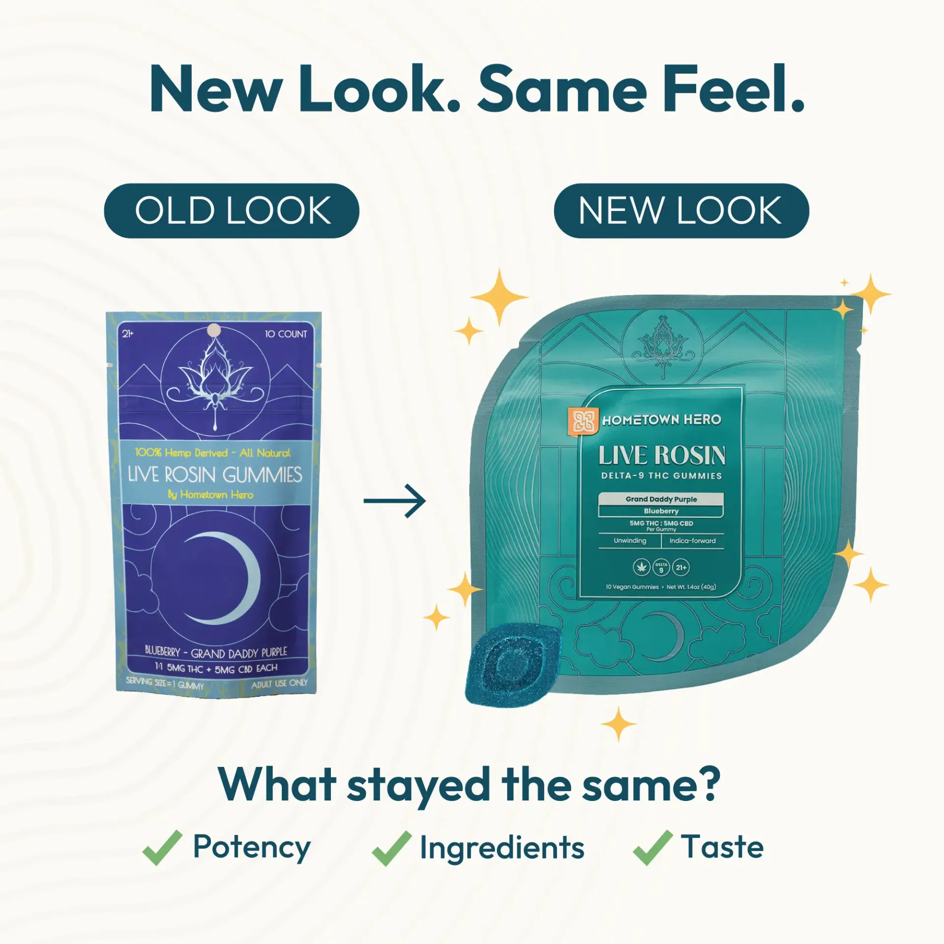 To deliver the experience of this beloved strain, we pressed live rosin from Grand Daddy Purple that was bred into hemp and then paired with hemp-derived Delta-9 for synergy.
